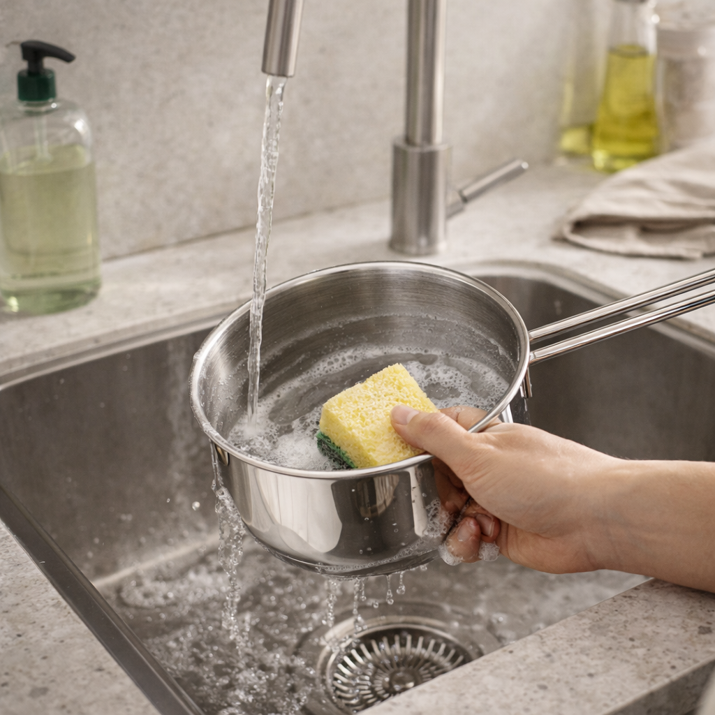 5. Si quedaron manchas oscuras del calor (normales en el acero), aplicá vinagre blanco unos minutos y enjuagá.